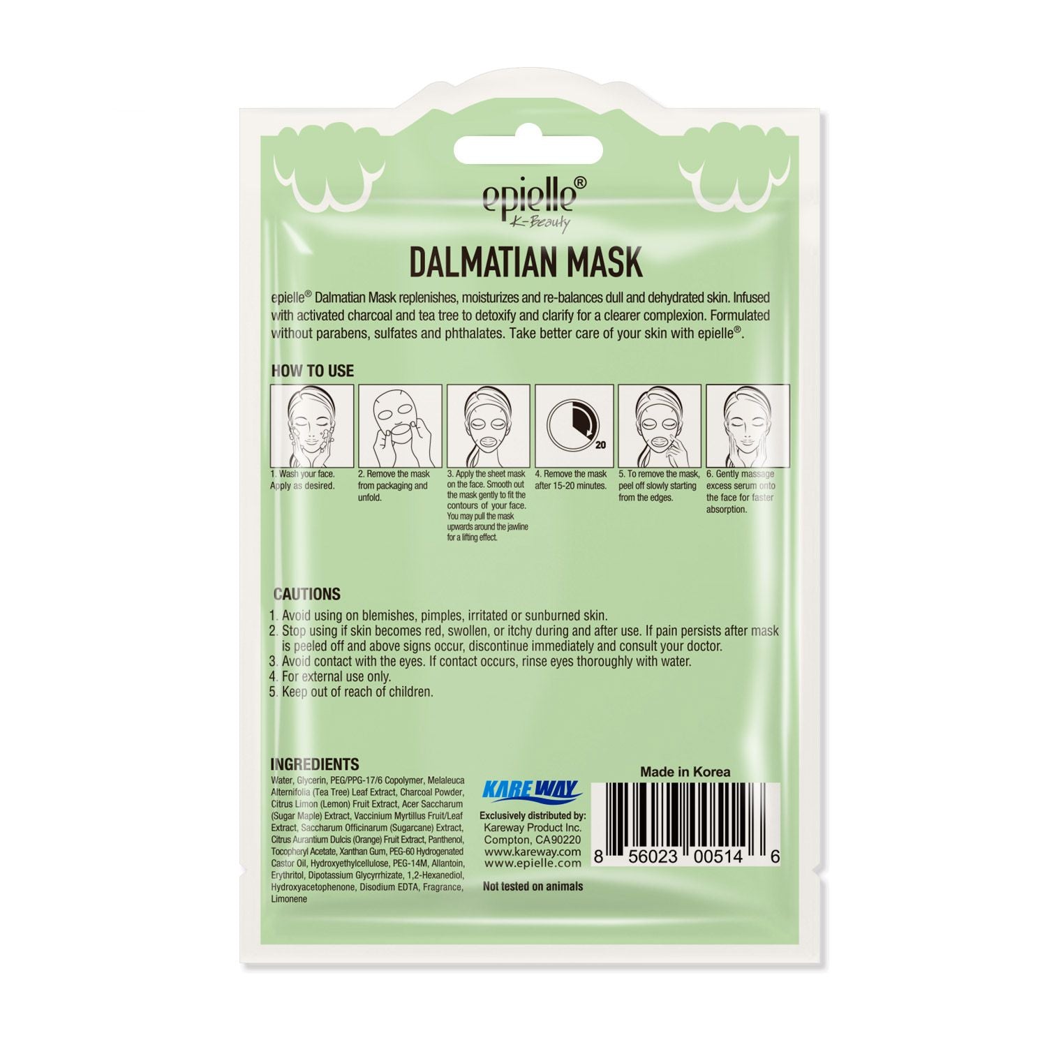 The epielle Dalmatian Sheet Mask revitalizes, hydrates, and restores balance to dull and dehydrated skin. It's enriched with activated charcoal and tea tree oil to detoxify and clarify, promoting a clearer complexion. This mask is formulated without parabens, sulfates, and phthalates, ensuring a gentle and effective skincare experience.