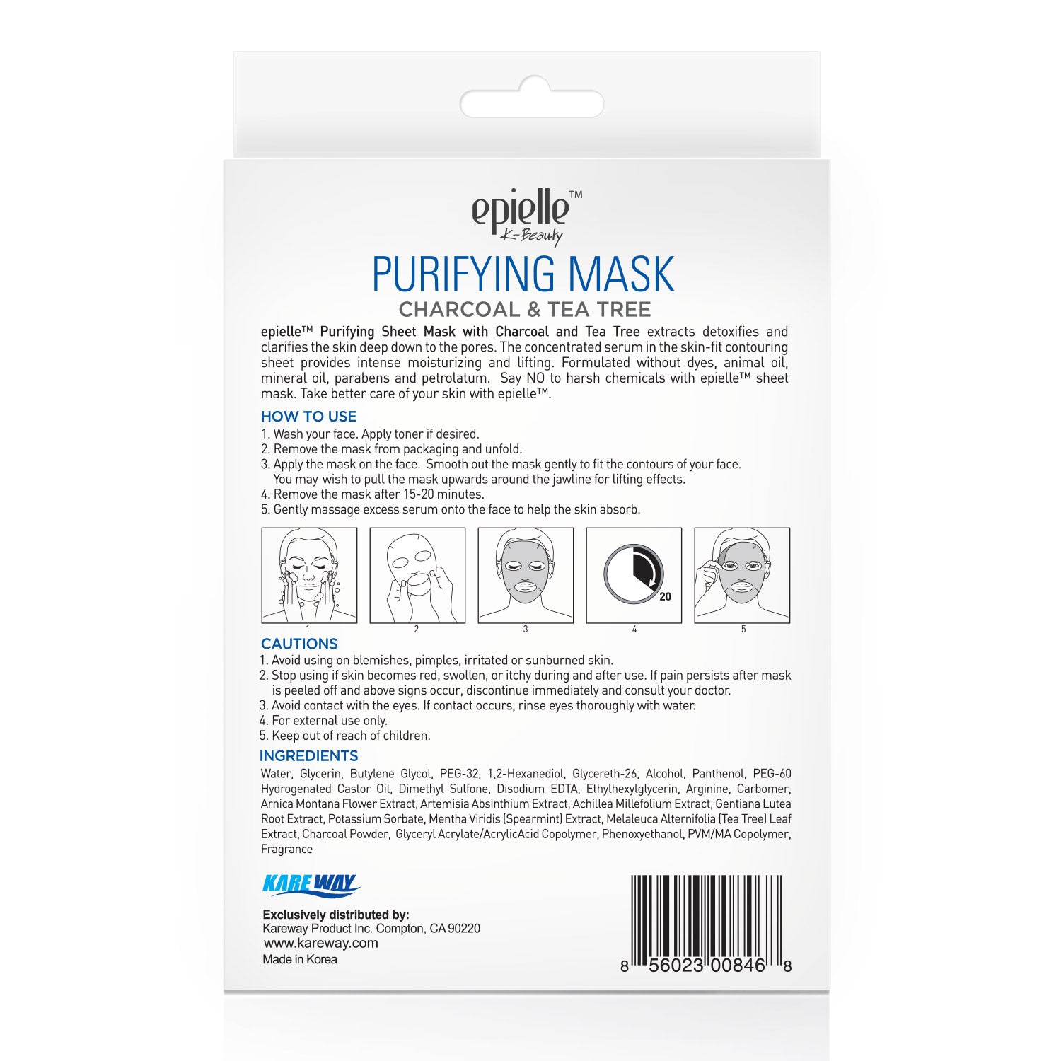 Experience the deep-cleansing benefits of the epielle Purifying Sheet Mask, infused with Charcoal and Tea Tree extracts. This mask detoxifies and clarifies your skin, reaching deep into the pores. The skin-fit contouring sheet is soaked in a concentrated serum that delivers intense moisturization and a noticeable lifting effect. Formulated without dyes, animal oil, mineral oil, parabens, and petrolatum, this mask offers a pure and effective treatment for clearer, refreshed skin.