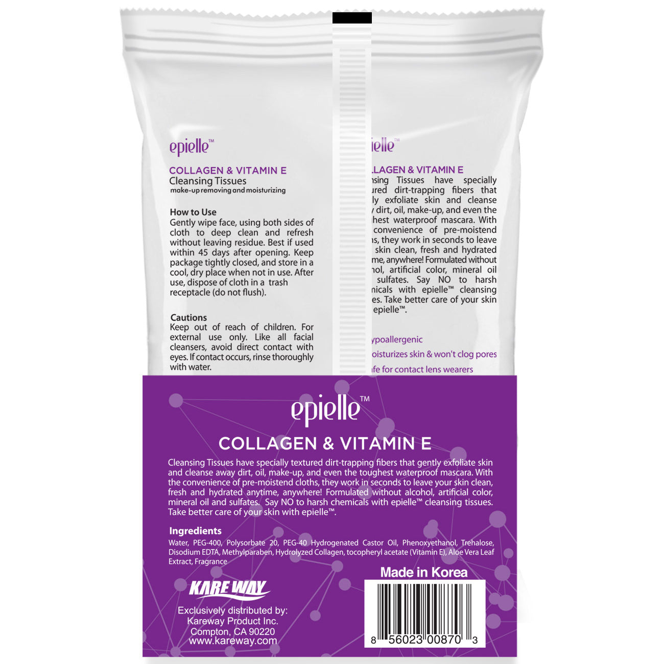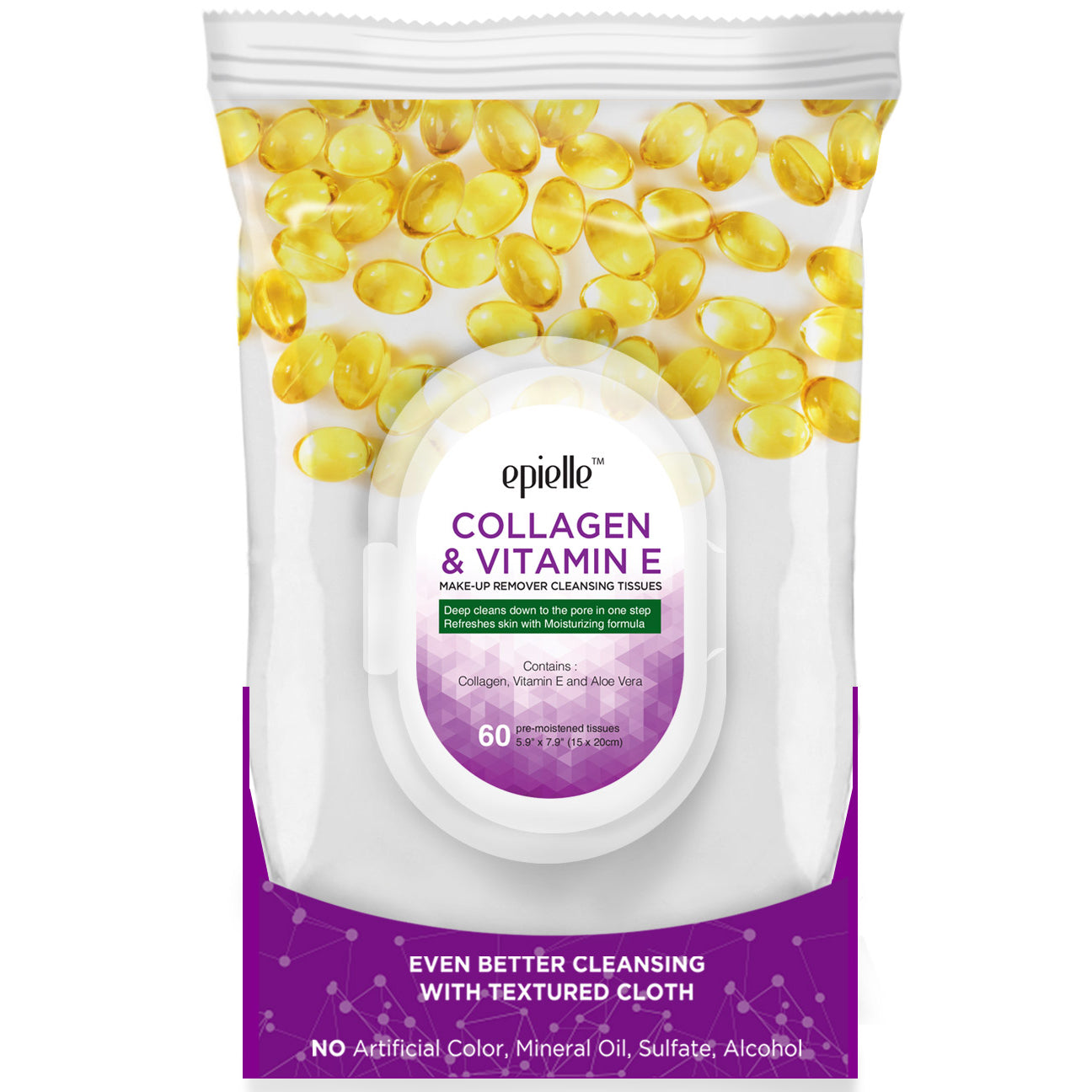 Discover the cleansing power of epielle Collagen & Vitamin E Make-Up Remover Cleansing Tissues, featuring specially textured fibers that trap dirt while gently exfoliating the skin. These pre-moistened cloths effortlessly remove dirt, oil, makeup, and even waterproof mascara, leaving your skin clean, fresh, and hydrated in just seconds.