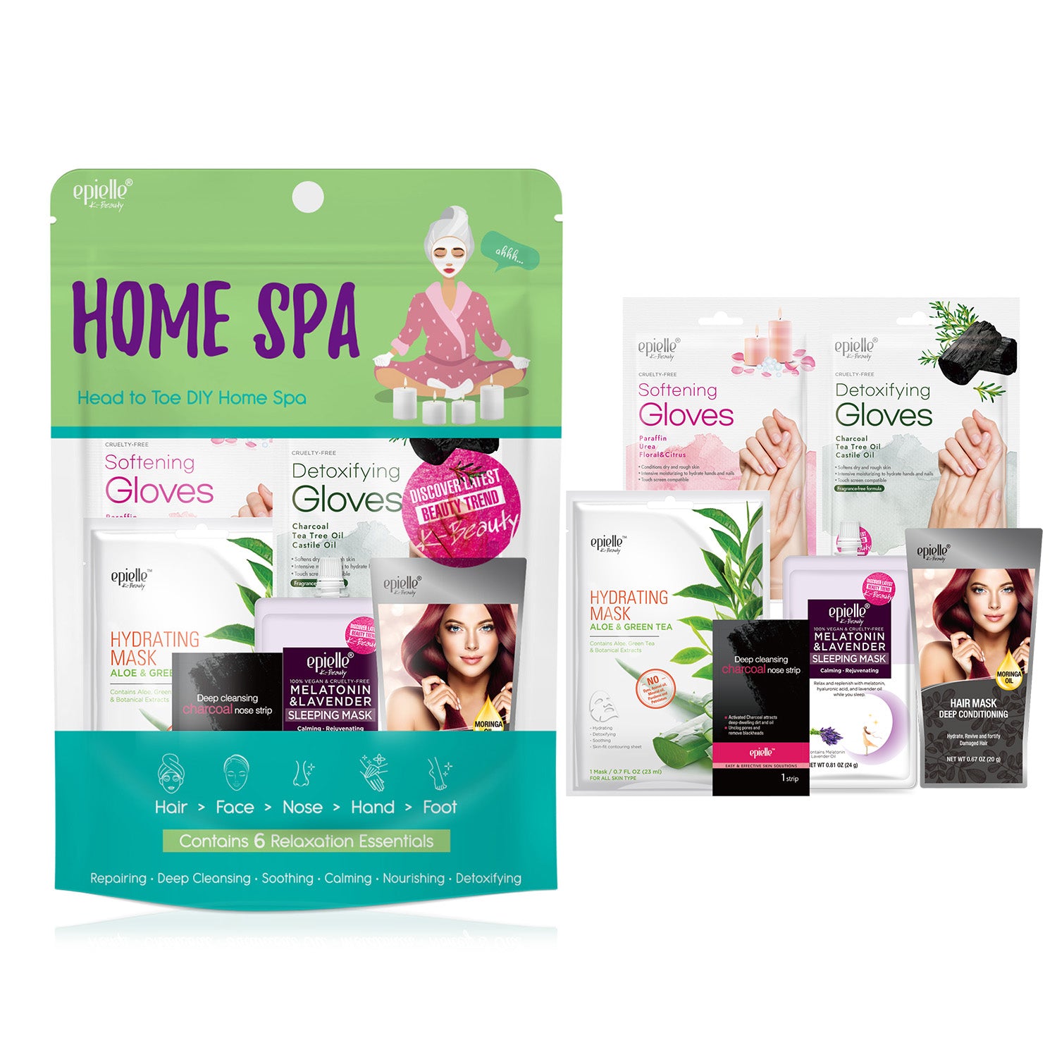 Discover the epielle Home Spa Kit, featuring six essential products for skincare, haircare, and body care, designed to rejuvenate and reveal your skin's natural beauty. This ultimate kit provides everything you need for a head-to-toe glow, making it effortless to enjoy a spa day right at home. Pamper yourself with this comprehensive collection and transform your routine into a luxurious spa experience.