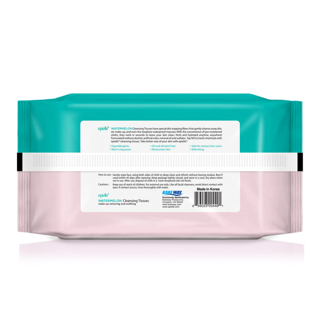 Introducing epielle Watermelon Makeup Removing Cleansing Tissues, designed with special dirt-trapping fibers that delicately cleanse away impurities, makeup, and even stubborn waterproof mascara. With the ease of pre-moistened cloths, these tissues provide quick and efficient cleansing, leaving your skin feeling clean, refreshed, and hydrated no matter where you are!